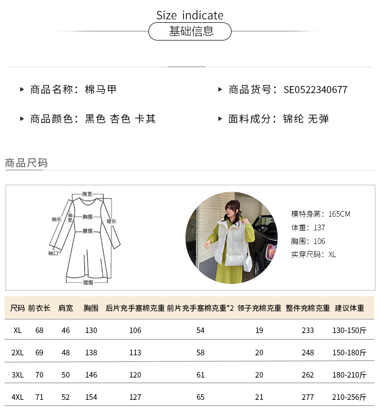 4XL前衣长71 肩宽52 胸围154 拉链长40 后片充手塞棉克重127 前片塞手塞棉克重*2 65 领子充手塞棉克重21 整件充棉克重277 建议体重210-256斤