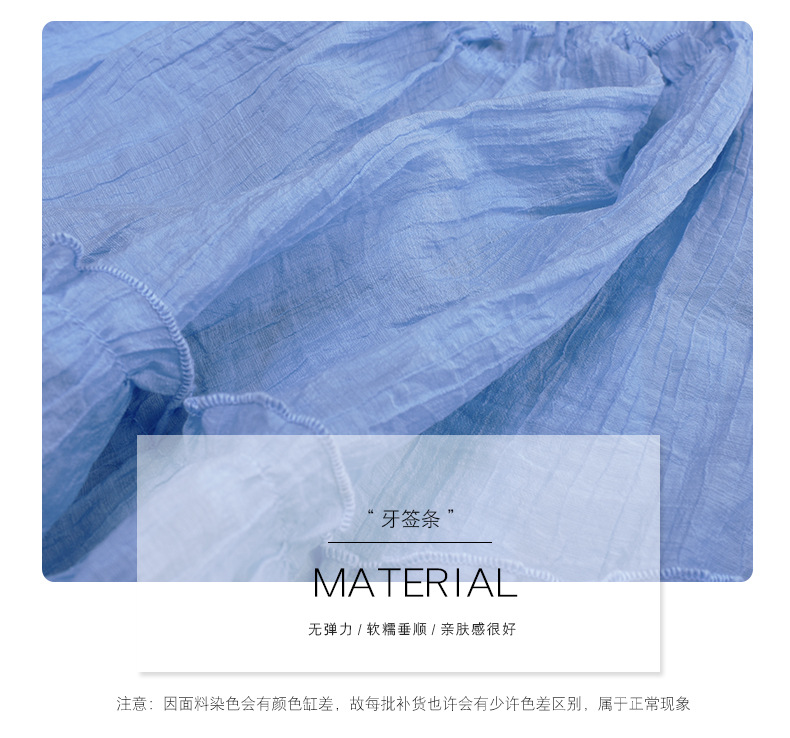 柔雾轻盈的牙签条面料,自带竖向褶皱纹理,透气柔软无弹力